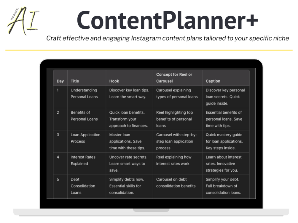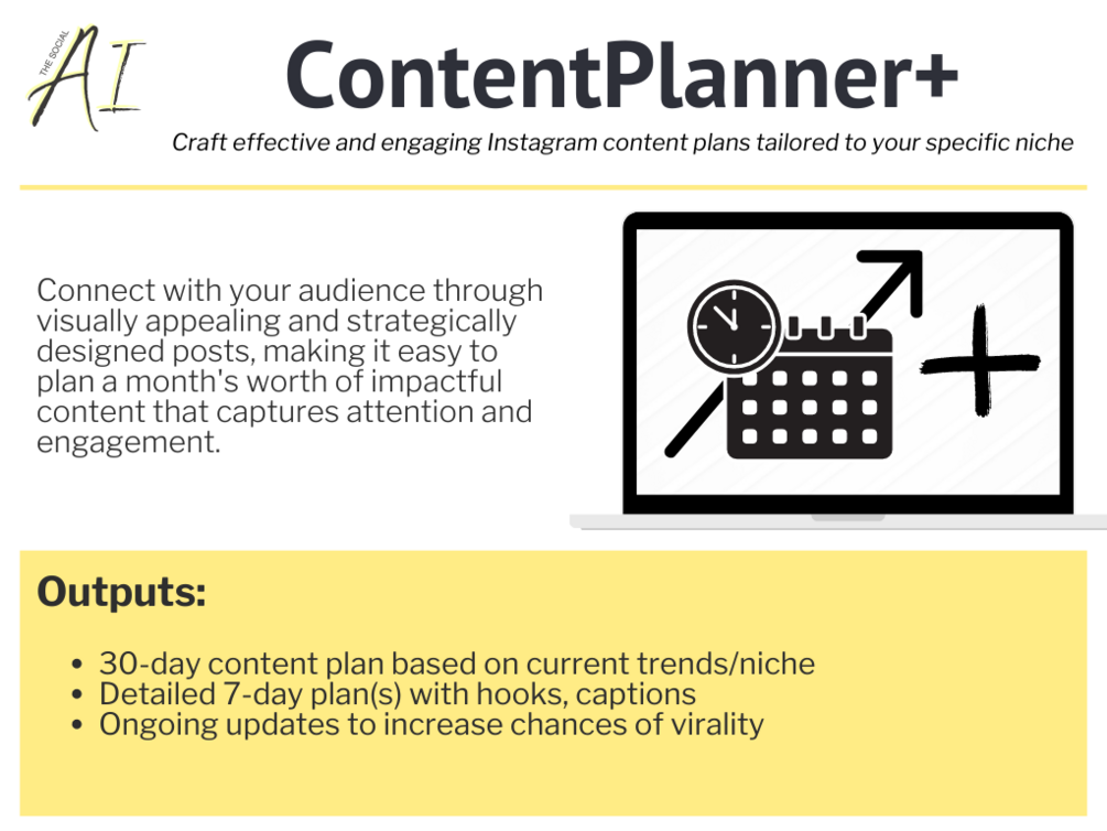 - ContentPlanner+: Develop a month-long content schedule for Instagram, tailored to captivate your audience with visually stunning and strategic posts.