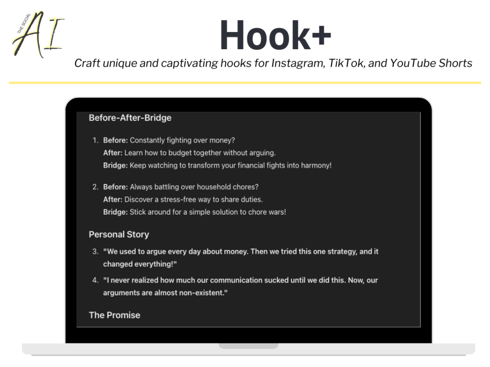 - Hook+: Create 10 unique hooks for platforms like Instagram, TikTok, and YouTube to grab attention and drive interaction.